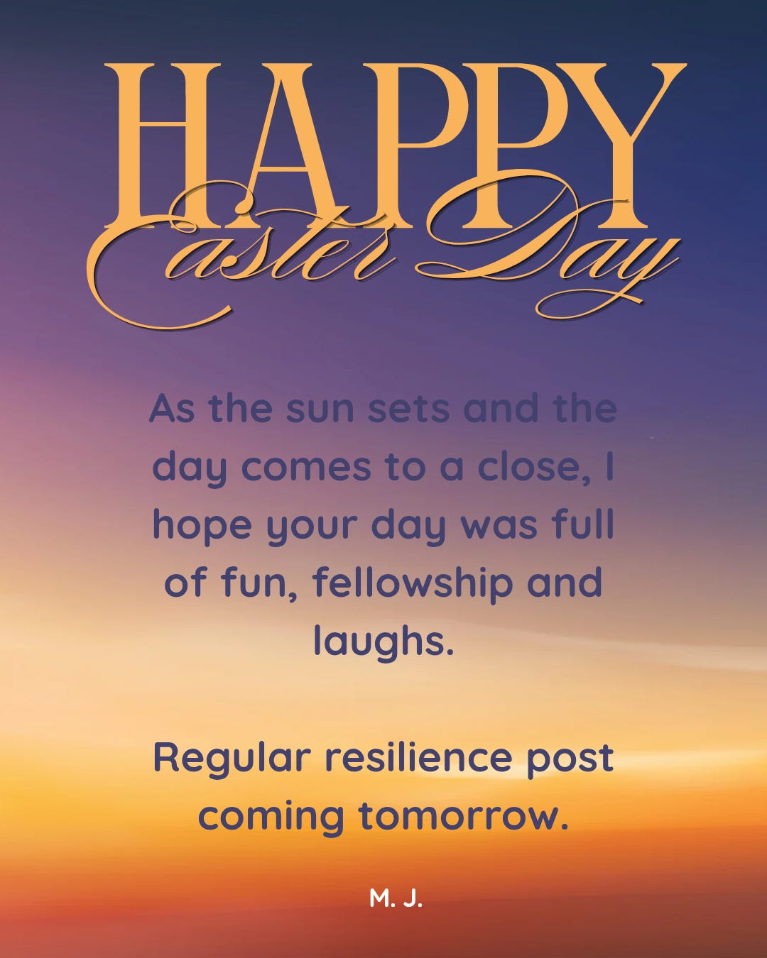 Happy Easter!M JApr 06, 2026111ShareToday, I took my own reflections and lived them out: I took the time to reset and recharge. I hope you've had a wonderfully refreshing holiday. I'll see you tomorrow with a full resilience post.PreviousNext